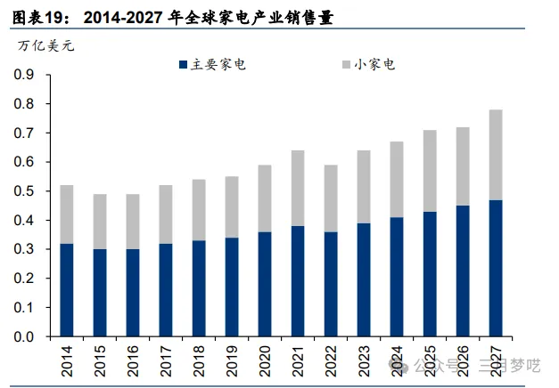 全球家电市场需求稳步提升,科技时代的到来促使家电品牌迈向智能化。根据数据,2022 年全球家电市场营收将达到 0.59 万亿美元,且预计将在 2022-2027 年以 CAGR 为 5.77% 的速度增长;2022 年全球家电市场销量将达到 41.89 亿台,且预计将在 2022-2027 年以 CAGR 为 2.59%的速度增长。