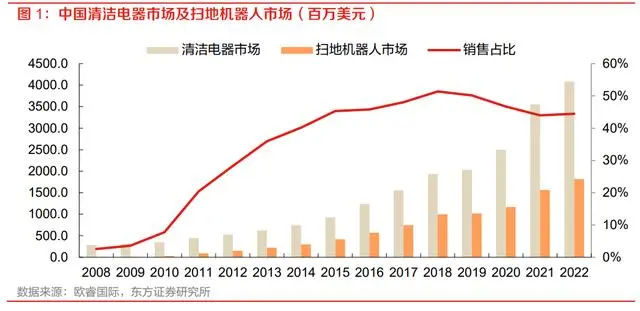 根据欧睿国际数据显示,2022年中国大陆清洁市场规模达40.85亿美元,扫地机器人销售额占清洁电器总销售额44%。