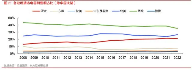 清洁电器海外市场广阔:根据欧睿国际数据显示,2022 年海外清洁电器市场规模达 235.37 亿美元,分地区来看,各地区市占率相对平稳,西欧和北美地区依旧是主要的清洁电器消费地区,2022 年市场规模分别达到 82.98 亿与 62.45 亿美元。数字化转型网www.szhzxw.cn