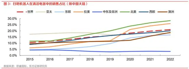 产品渗透率:从形态功能上来看,清洁电器可以分为传统吸尘器与智能扫地机器人两种形态,随着技术与人们接受程度的不断提升,扫地机器人在清洁电器中的渗透率在稳步增长,排除中国大陆市场影响后,按照产品形态划分计算,海外扫地机器人在清洁电器中的销售占比由 2015 年 10.6%提升至 2022 年 21.1%。其中北美与拉美地区涨幅明显。