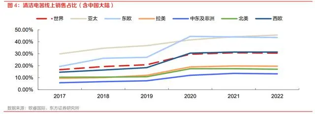 销售渠道:由于清洁电器价格低,体积小,无需安装的特点非常适合线上销售,19 年疫情以来线下场所的封闭加速了线上渠道的发展,改变了人们的消费习惯,根据欧睿数据显示,全球清洁电器(含中国大陆)线上电商渠道渗透率由 2017 年 16.7%达到 2022 年 30.5%。数字化转型网www.szhzxw.cn