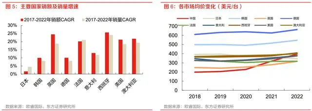 (2)第二类市场是销量与销售额几乎同比例提升的国家,该市场特点主要是均价稳定,此类市场 2017-2022 年均价 CAGR 约-1%~1%,市场销售总额伴随销售量同步提升,处于市 场扩张时期。