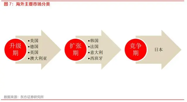 二、主要市场可分为升级、扩张、竞争三阶段,全球整体处于产品升级阶段