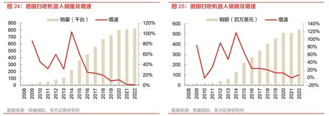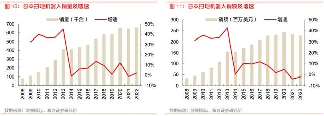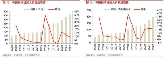 韩国市场扫地机器人销售量 2022 年达 36.37 万台,同比增长 9.5%,2017-2022 年 5 年 CAGR 为 8.2%,扫地机器人销售额 2022 年达 1.99 亿美元,同比增长 16.3%,2017-2022 年 5 年 CAGR 为 10%。韩国销量增速低于销额增速表明该国市场进入产品升级涨价阶段。