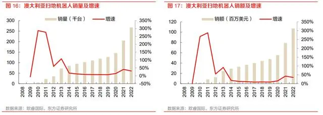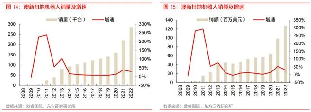 澳新地区:澳新地区扫地机器人市场总体销量及销额保持快速增长。澳新地区扫地机器人销售量 2022 年达 28.45 万台,同比增长 29%,2017-2022 年 5 年 CAGR 为 18.5%,扫地机器人销售额 2022 年达 1.27 亿美元,同比增长 28.5%,2017-2022 年 5 年 CAGR 为 19.5%。