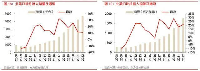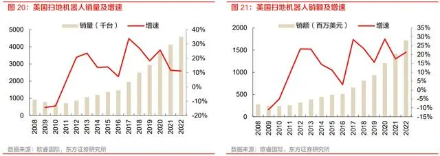 其中美国贡献了北美的主要增长,美国扫地机器人销售量 2022 年达 458.19 万台,同比增长 11.0%,2017-2022 年 5 年 CAGR 为 18.5%,扫地机器人销售额 2022 年达 17.2 亿美元,同比增 长 21.3%,2017-2022 年 5 年 CAGR 为 21.2%。