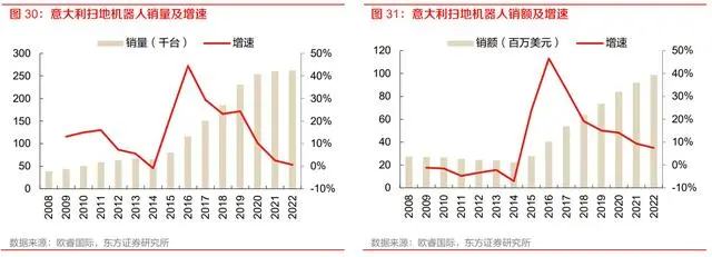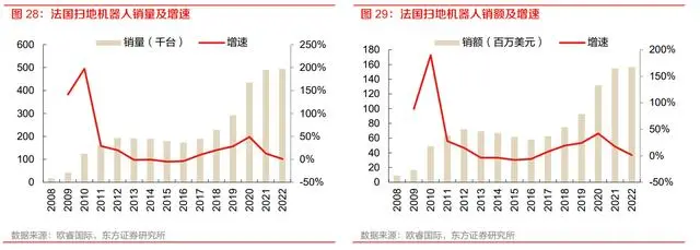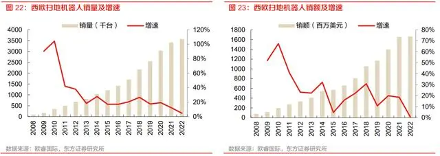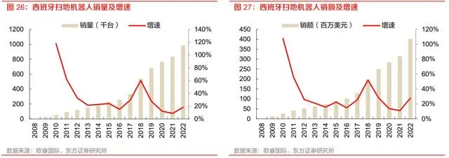 西班牙市场同样值得关注,西班牙扫地机器人销售量 2022 年达 98.6 万台,同比增长 18.2%,2017-2022年5年CAGR为24.1%,扫地机器人销售额2022年达4.02亿美元,同比增长27.7%,2017-2022 年 5 年 CAGR 为 25.7%。