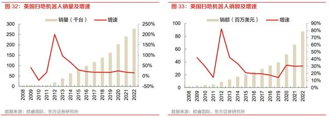 英国扫地机器人销售量 2022 年达 27.73 万台,同比增长 15.3%,2017-2022 年 5 年 CAGR 为 18.8%,扫地机器人销售额 2022 年达 0.88 亿美元,同比增长 30.3%,2017-2022 年 5 年 CAGR 为 24.5%。