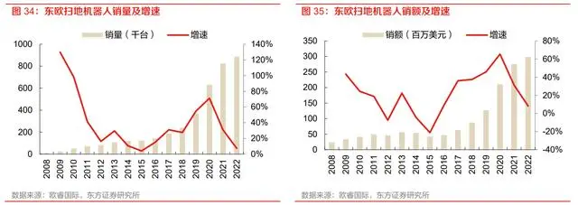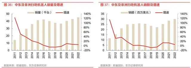 东欧地区:东欧地区扫地机器人销售量 2022 年达 88.56 万台,同比增长 7.4%,2017-2022 年 5 年 CAGR 为 36.5%,扫地机器人销售额 2022 年达 2.98 亿美元,同比增长 8.2%,2017-2022 年 5 年 CAGR 为 36.4%。