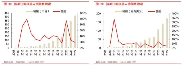 拉美地区:拉美地区扫地机器人销售量 2022 年达 41.7 万台,同比增长 18.7%,2017-2022 年 5 年 CAGR 为 36.2%,扫地机器人销售额 2022 年达 1.72 亿美元,同比增长 21.7%,2017-2022 年 5 年 CAGR 为 28.9%。