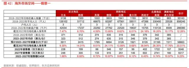 c) 处于竞争期的日本,随着竞争逐步激烈,短期内难以突破以价换量的竞争格局,扫地机器人均价延续 2017-2022 年 CAGR-2.5%的趋势,销量维持同期国内 CAGR4.5%稳定提升。