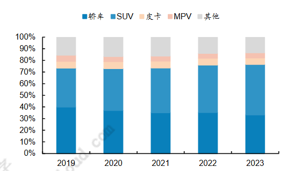 车型趋势:轿车和SUV是全球乘用车市场的主力车型。SUV车型尤为突出,其销量占比自2019年起逐步上升,至2023年达到44%,销量约为3,841万辆。而新能源车型则稳步渗透市场,2023年销量占比达到16%,销量约为1411万辆。数字化转型网www.szhzxw.cn
