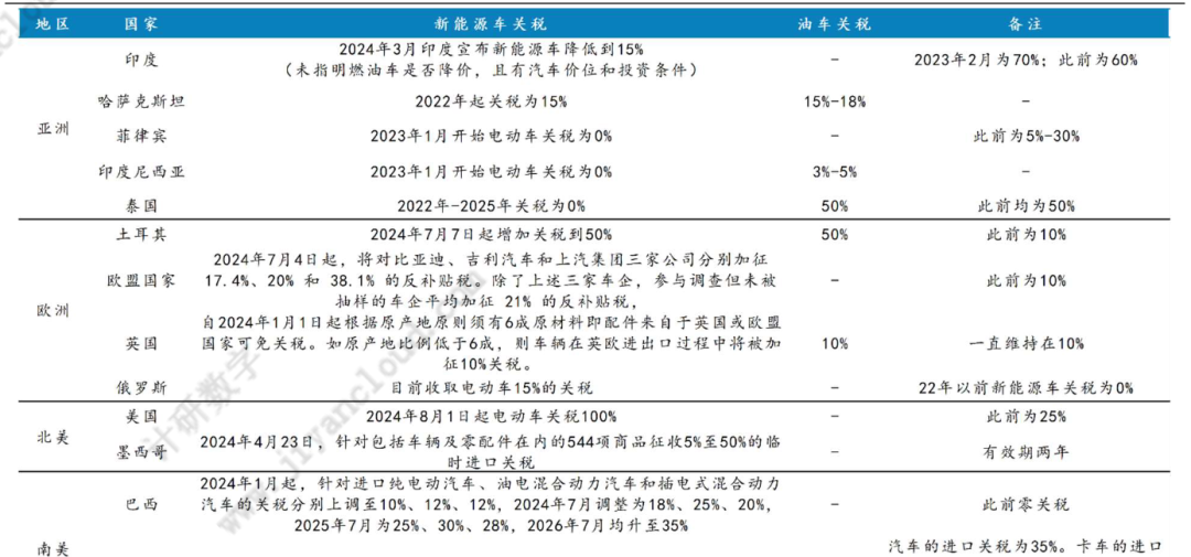关税政策影响:由于全球市场对中国出口的传统燃油车及新能源汽车采取了多样化的关税政策,中国车企纷纷海外建厂以规避不确定性因素。亚洲、非洲、中东、大洋洲采取较为关税友好的政策,而欧洲、北美及南美部分国家存在进一步提高关税的风险。数字化转型网www.szhzxw.cn