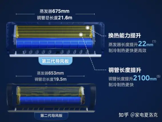 再加上风尊其实在内机上做了不少升级,采用全新一代室内机平台,比如蒸发器整体长度提升了22mm,铜管长度提升了2100mm,整机的换热效率有很大的提升。