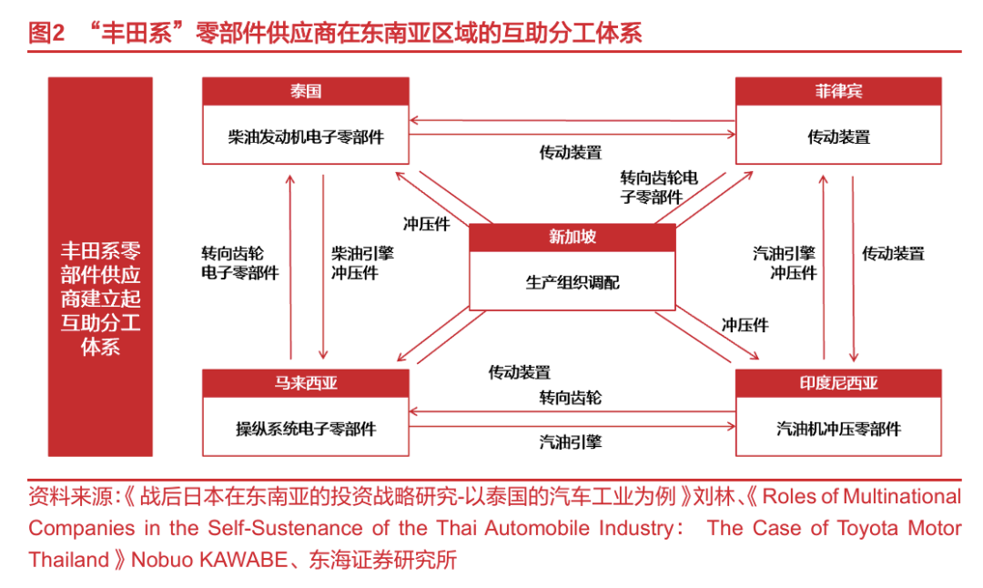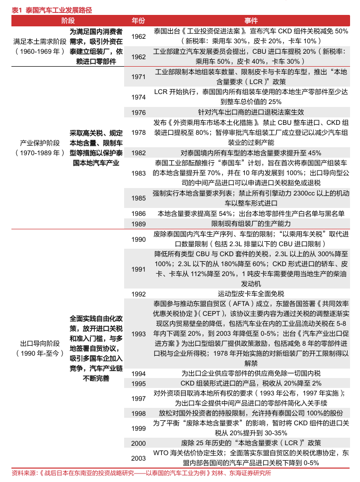 丰田顺应泰国汽车工业发展阶段,因地制宜调整生产模式。泰国汽车工业发展主要历经三个阶段:1)利用自身资源和成本优势,吸引外资车企在泰建立组装厂,力求以“市场换技术”;2)以高关税、规定本地含量要求等措施限制整车和零部件进口以保护泰国本土汽车产业;3)汽车生产从满足本土需求向出口转变,并开始践行自由化政策,通过降低关税、与多地签署自贸协议、放开汽车行业外资持股比例等方式吸引欧美车企加入泰国汽车市场的竞争,进而扶持金融危机下难以生存的本土制造业以及迫使外资增加技术转让。丰田在日本政府的支持下,及时调整生产结构和市场策略,以把握泰国汽车产业政策红利,逐渐在泰国构筑了坚固的产业链体系和优势地位: