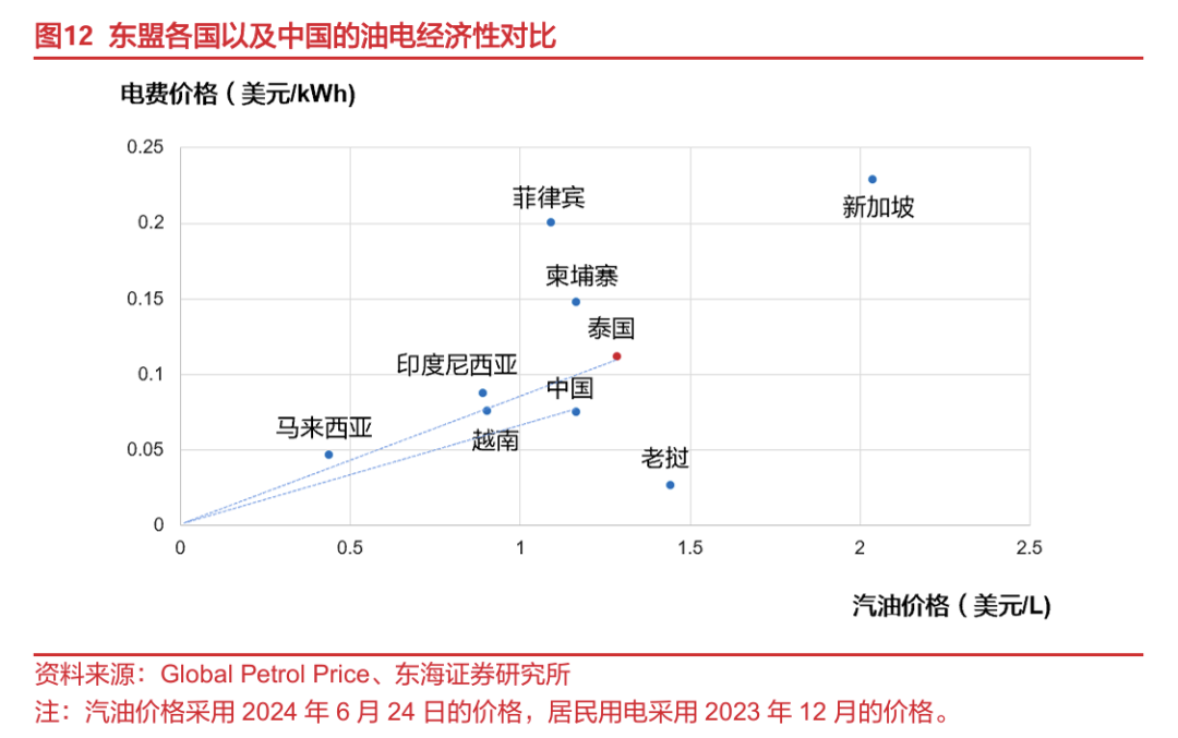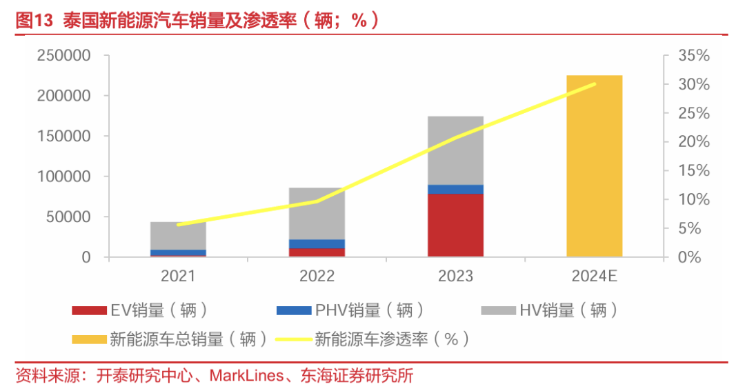 泰国具备油电切换的经济性,对新能源汽车的需求日益走高。以汽油和居民用电作为标准,我们发现泰国的油电价差在东盟国家中靠前,与中国相仿,具备电动切换的经济性。此外,2020年泰国整体汽车销量受疫情影响同比下滑21.84%的背景下,泰国新能源汽车(EV+PHEV+HV)销量同比+13.23%,2021-2023加速高增,CAGR达100.22%。我们认为,泰国新能源汽车对燃油车的快速替代可以对标中国(2005-2015年,10年间新能源渗透率仅突破1%,2016-2019年提升到5%,2020年后迎来爆发式增长,2021/2022/2023年渗透率分别突破14%/27%/33%,2024年7月国内新能源车全月零售渗透率达50.84%,首次超过传统燃油乘用车),新能源汽车渗透率将在短期内实现快速攀升,尤其是纯电车型,综合考虑2024年曼谷车展新车周期释放、泰国EV3.5电动车激励政策生效等因素,预计2024年泰国新能源汽车销量将达22.50万辆左右,其中纯电车销量占比约48.86%。