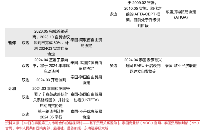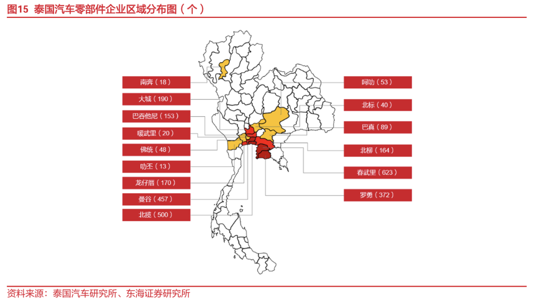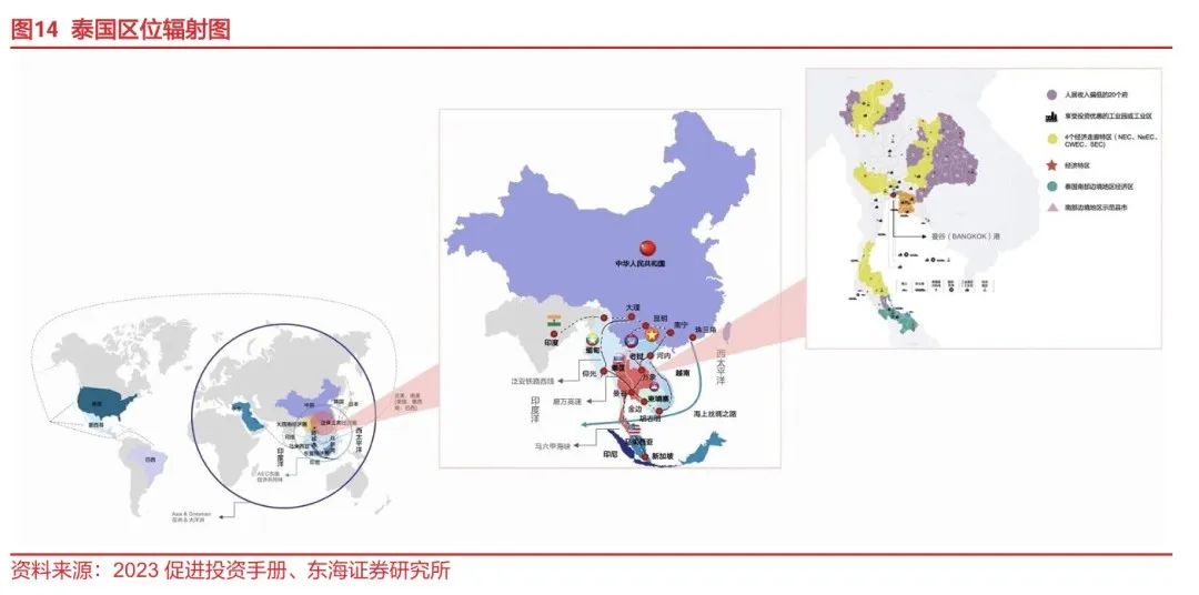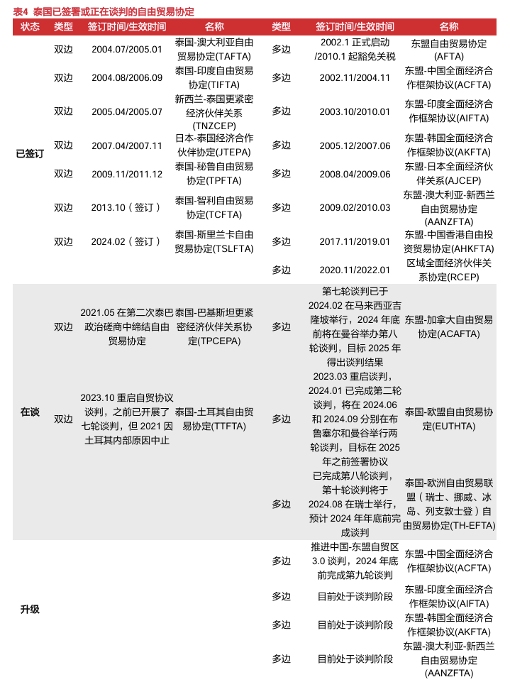 中泰两国贸易粘性强、文化隔阂少,利于中资车企在泰投资和发展。1)中泰两国双边贸易关系牢固:中国连续11年成为泰国第一大贸易伙伴,泰国是中国在东盟国家中第三大贸易伙伴,中泰2023年双边贸易额达1262.8亿美元,同比-5.0%,泰国贸易逆差为251.92亿美元,而泰国与多数东盟国家以及澳大利亚、新西兰等国家则保持了贸易顺差;中国对泰国的直接投资总量及规模呈指数级增长,2023年中国对泰国的投资申请共430个项目,同比+172.15%,投资总额达1590亿泰铢,同比+105.93%,占泰国全部外来投资的24%,稳居首位;2)中泰达成了一系列经贸、金融合作协议以减少关税、标准法规、货币流通等方面的贸易壁垒,经济依存度逐年增加:《中国-东盟自由贸易协定》、《区域全面经济伙伴关系协定》(RCEP)、《关于成立中泰经济联合合作委员会协定》等经贸合作协议的签订为中国车企在泰投资提供了稳定开放的环境,《中国人民银行和泰国银行关于促进双边本币交易合作框架的谅解备忘录》等金融协议的签订也有助于提高双方在商品和服务交易中的支付便利性和效率,同时RCEP要求成员国之间减少标准技术壁垒,形成统一的标准法规,也便于中国车企生产的汽车进行出口认证;此外,中国与泰国签署的互免签证协议已于2024年3月1日起生效,也有助于促进两国贸易往来和人才、技术交流;3)中泰之间文化、品牌认同、汽车需求契合性相较欧美更高:相较于老牌车企聚集的欧美地区的消费者对品质和服务的高要求,泰国的汽车消费者更偏向于性价比高的经济型车型,品牌忠诚度相对较低,并且中泰文化隔阂也相对较少,因此,中国电动车现阶段提供的产品、技术与泰国汽车消费者的需求更为吻合,这种契合性有利于中国汽车品牌进入泰国市场。