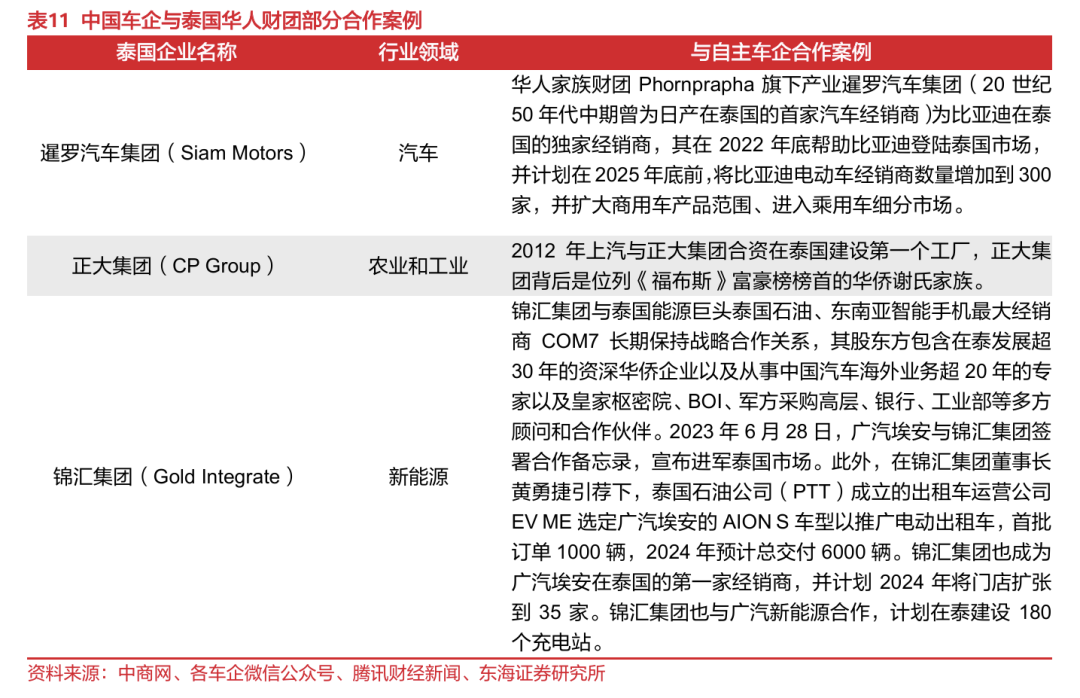 泰国华裔“搭桥”,有望助力中国车企在体系“作战”能力上赶超日本车企。日系车企在海外高度重视体系作战,除了整车厂之间、整车厂与零部件厂商之间的协同,在日本商社的牵头下,在泰的日资企业还为日本整车厂提供了信息搜集、金融服务、公关传媒等系列服务。泰国华人华侨总人口约1000万,占泰国总人口的12%-14%,掌握了泰国近70%的财富,根据2023年《福布斯》富豪榜,前十名中有六名是华人。华裔在泰国政商界话语权高,在金融界,泰国四家最大的私人银行由华人控制;在政界,1932-2023年,泰国30任总理中,22人有华裔血统,且华裔在泰国内阁和国会中常年占比超60%;在商界,华人控制了约80%的上市公司资产,泰国前70大企业中仅有3家无华裔背景。华人家族财团能够引荐中国车企与泰国政府高层建立联系,帮助其了解泰国新能源投资及消费促进政策及竞品销售情况等信息,并在销售服务、渠道建设、大客户开发、人员/资金准备、电动车基础配套设施建设等方面与中国车企实现合作共赢。