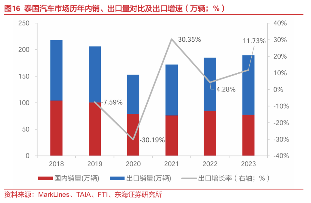泰国传统汽车工业基础好,能够支撑新能源汽车产业发展。1)泰国汽车供应链成熟:根据ILO数据,全球最大的100家零部件和配件供应商中超60家在泰国建立了生产基地,泰国当地汽车零部件供应商提供了该国汽车生产中使用的80%-90%的汽车零部件,完善的汽车供应链体系能为外资车企在泰发展新能源整车业务提供支持。2)泰国汽车市场以出口为导向:根据泰国汽车工业协会(TAIA)统计,2023年泰国汽车整车出口量达111.75万辆,占总生产量的60.90%,且根据世界贸易组织(WTO)数据,泰国2020-2022年稳居亚洲第四大汽车出口国。以出口为导向、具备完善汽车供应链体系的泰国市场能够为中资车企在泰发展新能源车业务以及全球化产业布局奠定基础。