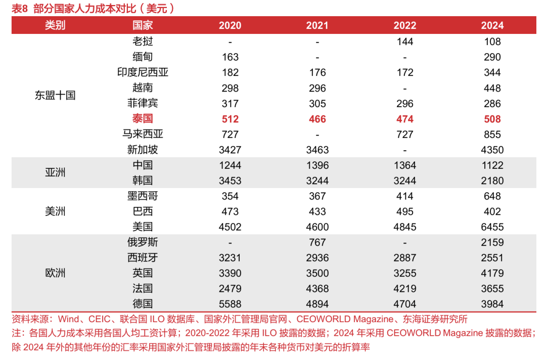 泰国区位优势明显、人力成本相对低廉,气候适宜电动车市场发展。1)区位优势:泰国地处东盟国家中心,与马来西亚、柬埔寨、缅甸、老挝接壤,为海上丝绸之路的必经之地,区位优势突出,经济集聚辐射效应强;且位于中南半岛,临近中国、日本、韩国、印度等国家,拥有众多大型港口,2022年泰国海港吞吐量约1亿吨,其唯一国家级经济特区“东部经济走廊”位于印度洋与西太平洋(3.230, 0.11, 3.53%)的海上航线中点位置,地处要道,海运条件佳,为成为制造和物流中心提供了良好的区位条件;2)气候条件:泰国大部分地区属热带季风气候,最冷月份的平均最低温度约为22℃,气候条件有利于规避纯电车冬季续航打折的短板,适合纯电车的发展;3)人力资源成本:泰国劳动力成本相对低廉,约为中国的一半,有助中国车企在海外生产的产品实现降本并保持高性价比优势。