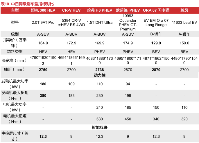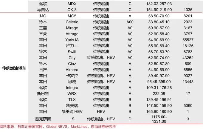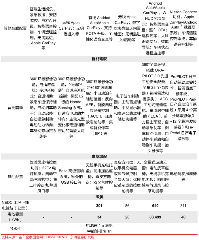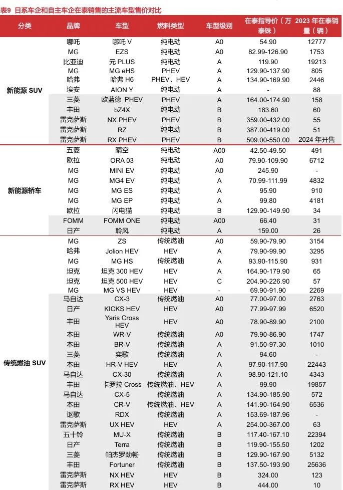 “高性价比+智能化+定制化”兼顾,中国车企以产品力构建口碑。德系的奥迪、宝马、奔驰等品牌的车型售价基本在40万元以上且聚焦B级以上车型,日系车与自主品牌的价格带及车型定位重合度最高,正面竞争抢夺泰国B级及以下车型市场。1)中国品牌新能源车相对日系车具有低价高配、智能化突出的特点:中资车企在泰销售的轿车产品以纯电车为主,SUV兼顾纯电和混动(PHEV+HEV),通过对中日同级别车型对比来看,自主品牌混动产品在空间、动力性能表现方面大多优于日资车型,纯电车在续航、智能驾驶体验方面突出,为泰国消费者提供越级体验;2)本地化产品调整迎合泰国汽车市场需求:自主品牌在泰投放的基本是在泰国市场最受欢迎的入门级右舵车型,通过推出符合泰国本地审美的新配色、在车机引入泰国当地流行的APP和泰语语音识别、开发高防尘防水等级电池包等方式提高车辆本土化、定制化程度以满足泰国消费者个性化需求。比如,右舵版极氪X和009均搭载了支持中文、泰语、英语的车机系统和语音交互功能,并加装了HERE地图导航、Zoom/Spotify等适配泰国市场需求的主流车机应用;名爵纯电动SUV EZS搭载达到UL2580标准的电池组,整车高压系统达到IP67防尘防水等级、涉水深度可达43厘米,充分适应泰国高温高湿、常积水的用车环境。因此,我们认为尽管日本车企在泰经营几十年积累起来的消费者信任度及品牌知名度不容小觑,但日本车企决策流程长,导致部分热销车型配置老旧。若中国车企能够凭借领先的三电技术及深厚的新能源车产业链底蕴,在实现规模化降本的同时,保证产品的质量和快速创新,则有望颠覆20世纪90年代中国摩托车企业在价格战下给东南亚消费者留下的“价格低、质量差”的刻板印象,在泰国汽车行业新能源转型浪潮中,凭借强产品力逐渐树立口碑,维持在泰国新能源车市场的领先地位。