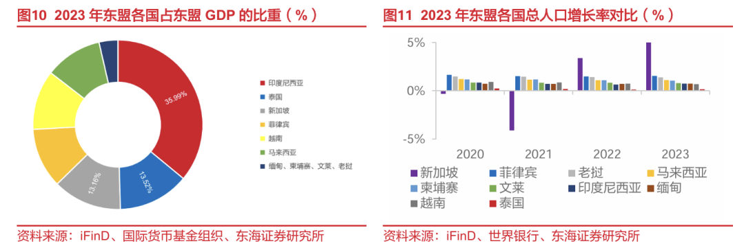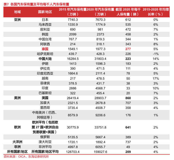 泰国人口和经济增速放缓,本土汽车市场或已进入存量市场阶段,迫切需要产业升级来激发市场新增长点。根据东盟统计部门数据,截至2023年年底,泰国汽车保有量约为1948.18万辆,同比+2.70%,2018-2023年保有量增速有所放缓;根据OICA数据,2015-2020年泰国在亚洲的千人汽车保有量位于第七位,保有量略超中国,处于世界中等水平。此外,泰国2023年名义GDP占东盟总GDP的比重达到13.52%,位列东盟国家第二;人均GDP和人口数量分别为7171.81美元和7180.13万人,在东盟排名第四,但名义GDP增速和人口增速在东盟国家中靠后。综合泰国人口、经济数据以及汽车保有量水平,我们判断泰国的汽车消费市场可能已经发展到普及期的中后阶段,未来汽车销量增速将放缓,泰国本土汽车市场已进入存量市场阶段,急需产业升级。
