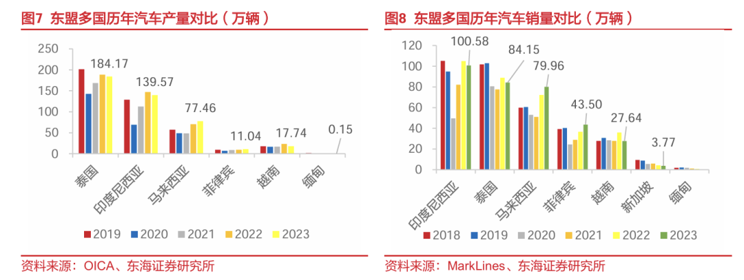 汽车为泰国重要支柱产业,泰国为东盟最大汽车生产国、第二大汽车销售市场。泰国汽车工业贡献了泰国10%左右的GDP,且汽车产业工人约占泰国劳动力人口的10%,多年来一直是泰国继旅游业后的第二大支柱产业,因此汽车工业在泰国的经济和社会发展中具有重要地位。产量方面,根据世界汽车组织(OICA)统计,2023年泰国汽车产量为184.17万辆,位列全球第十、东盟第一;销量方面,根据MarkLines数据,2023年泰国汽车销量达84.15万辆,仅次于印度尼西亚,位列东盟第二。