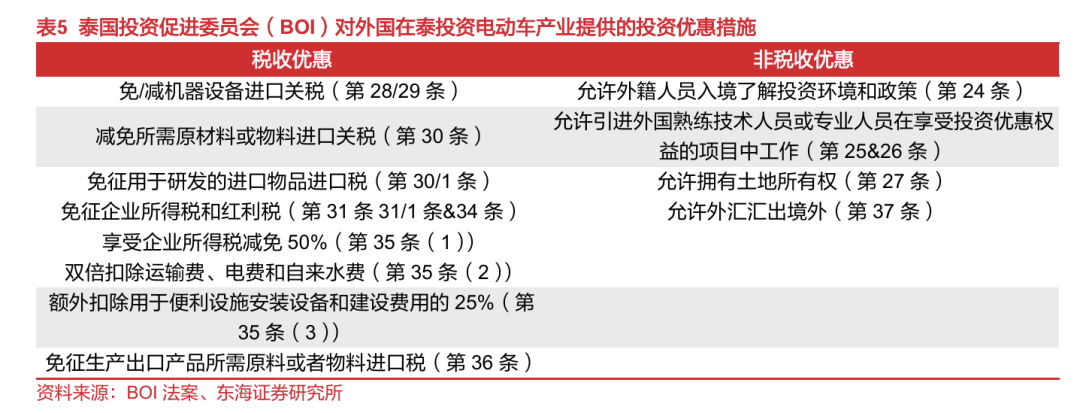 泰国通过现金补贴、税收优惠及非税收支持政策等多元化方式,支持新能源汽车在泰发展。1)提供车辆购置补贴、减/免征关税和消费税:泰国政府电动汽车激励措施已从EV1.0迭代到EV3.5,从EV3.0开始在原有减免企业所得税等政策的基础上,大幅降低纯电车进口关税和消费税,并提供电动车(电动乘用车、纯电动皮卡车、电动摩托车)购置现金补贴,且将新电动车的年度注册税降低了80%以鼓励电动汽车市场消费。2)出台外商投资泰国汽车产业支持政策:泰国对外资企业投资汽车产业提供了投资优惠,比如,对投资额≥50亿泰铢的车企给予100%外资控股、永久所有权地契以及免征最高8年企业所得税等优惠条件以吸引外资来泰建厂;泰国投资促进委员会(BOI)于2022年11月3日批准了针对长期投资企业、总部和研究及生产基地向泰国的全面搬迁方案以及氢燃料汽车的生产和电动汽车换电站的部署等活动的投资激励方案,并且已从2023年1月开始实施;此外,BOI还出台了允许外籍人员入境了解投资环境和政策、允许外汇汇出境外等多项非税支持政策,为车企在泰投资提供便利。3)促进完善电动车供应链和基础配套设施:针对电动汽车普及的关键环节——电池生产和充电设施建设方面,泰国也制定了相应的优惠政策,比如通过推出公共充电运营商特殊电价政策、规划与资助公共充电站、免除充电站企业所得税等方式,为新能源车基础设施加速完善赋能;同时,泰国也支持电池等新能源汽车产业链发展,比如对满足条件的泰国电池制造商(生产用于电动汽车和储能系统的电池,电池能量密度不低于150Wh/kg能量密度、测试温度20-25℃、电池寿命周期≥1000次、放电深度≥80%)提供现金补助,降低电动车电池材料的进口关税等。