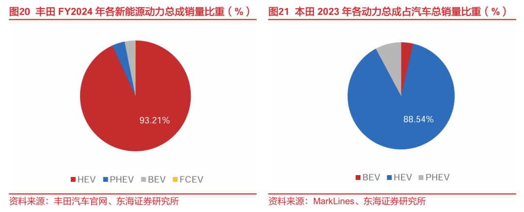 日系车电动化转型缓滞,中国车企借机“换道超车”。日系整车厂出于对本国能源结构(锂电池的关键材料锂、钴、镍等高度依赖进口,核电停运导致日本电力供应锐减)以及延续自身内燃机技术优势的考虑,将汽车新能源转型的重点放在了混动和氢能领域,导致电动车领域发展相对迟缓。以丰田和本田为例,根据丰田官网数据,2024财年,丰田新能源汽车中混动车(HEV+PHEV)、纯电动车(BEV)、燃料电池汽车(FCEV)的销量占比分别为96.86%、3.03%和0.10%;此外,根据MarkLines数据,2023年本田纯电动车(BEV)的销量仅占其新能源车销量的3.65%,混动车(HEV+PHEV)占新能源销量的比重较2022年提升1.82pct至96.35%,混动车仍占据日系车企新能源销量的主要份额。与此同时,中国企业更聚焦三电技术的突破,根据SEN Research发布的数据,2024年M1-4全球动力电池装车辆Top10中的企业中有六家为中国企业,市占高达63.9%,中国车企有望绕开日系车企在变速箱等领域建立的专利壁垒,凭借电动车产业链成本优势,加速抢占全球新能源车市场份额。