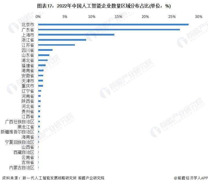 根据《中国新一代人工智能科技产业发展报告 2023》,2022 年,在 2200 家人工智能骨干企业的省份分布中,排名第一的是北京市,占比 28.09%; 排名第二的是广东省,占比 26.45%; 排名第三的是上海市,占比 14.23%; 排名第四和第五的分别是浙江省和江苏省,占比 8.95% 和 6.86%。