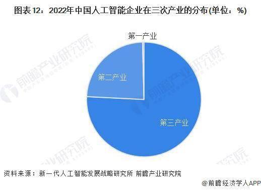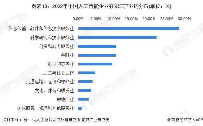根据《中国新一代人工智能科技产业发展报告 2023》,人工智能企业主要分布于第三产业,占比为 75.79%; 其次是第二产业,占比为 23.82%; 而第一产业占比仅有 0.39%。在第三产业中,排名第一的是信息传输、软件和信息技术服务业,占比 28.46%; 排名第二的是科学研究和技术服务业,占比 22.17%; 排名第三的是租赁和商务服务业,占比 10.75%; 排名第四的是金融业,占比 10.68%。其他行业占比较低,均为 10% 以下。 数字化转型网www.szhzxw.cn