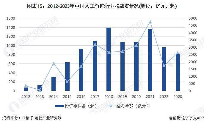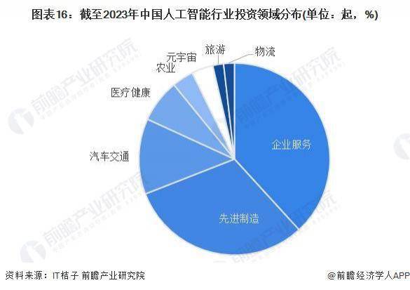 中国人工智能行业投融资活动在 2012-2018 年经历了快速增长,2018 年融资金额达 2668 亿元,投资事件 1396 起。2021 年达到历年峰值,融资金额增长至 4761 亿元,投资事件数 1362 起。2022 年中国人工智能行业的投融资活动进入相对冷静期,投融资数量和金额均呈现下滑态势,融资金额下降至 1731 亿元,投资事件数减少至 963 起。2023 年人工智能行业投融资活动有所回温,投资事件有所下降但是融资规模有所上升,融资金额达到 2631 亿元。截止 2023 年 12 月 14 日,中国人工智能行业总计共有 10110 起投资事件发生,总计融资金额为 37762 亿元。其中投资事件主要集中在企业服务、先进制造和汽车交通领域,占比分别为 38%、31% 和 13%。 数字化转型网www.szhzxw.cn