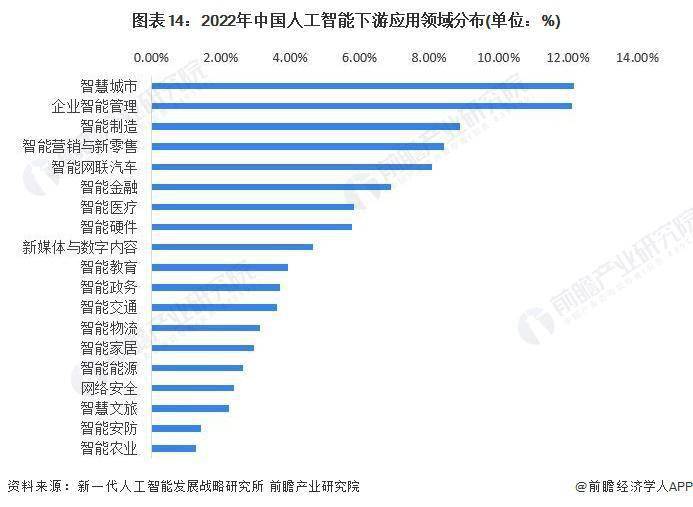 2022 年,在人工智能下游应用领域中,智慧城市和企业智能管理的占比较高,分别达到 12.16% 和 12.10%。智能制造、智能营销与新零售、智能网联汽车的占比都在 8% 左右,分别为 8.89%、8.41% 和 8.07%。随着人工智能技术在不同产业的应用逐渐加深,人工智能已深刻重构着社会生产、分配、交换、消费等各个环节,并持续催生新技术、新产品、新产业,推动社会进入智能经济时代。