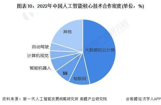 从人工智能核心技术的合作密度来看,大数据和云计算的占比接近一半,达到 46.47%; 其次是物联网和 5G 技术,分别达到 10.7% 和 8.1%; 智能机器人、计算机视觉、自动驾驶分别占比 6.39%、4.08%、4.05%。