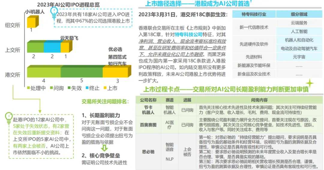 2023年,共有18家AI公司进入IPO阶段,而其中12家选择港股上市,除了全球化募资的野心外,更大原因在于港股对高新技术企业上市的财务指标要求表现出明显的宽松倾向,预计未来会有更多AI公司选择冲刺港股。与此同时,AI公司上市过程仍旧相对反复曲折,许多公司多次重复交表,而进入问询阶段后,企业面临对长期盈利目标与战略更加严格细致的拷问。