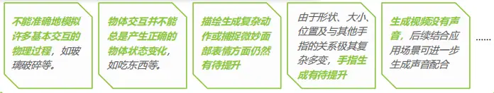 ✓ 视频内容对物理规律的理解:没有人为约束下视频内容满足物理学规则,但仍存在局限性