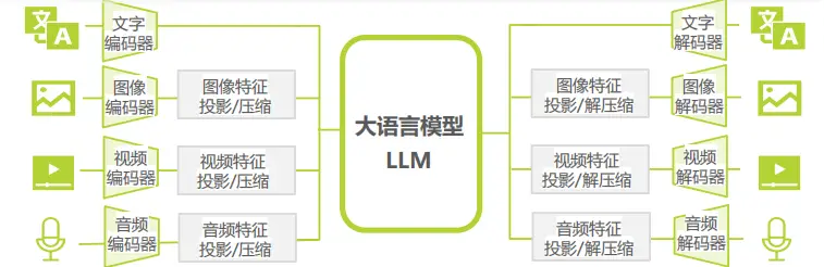 多模态大模型领域的技术栈尚未收敛,但当前主流方式基本以大语言模型为核心,主要手段将其他模态数据统一转化为LLM能够理解的向量表征,从而实现语言与其他模态数据在理解和输出方面的对齐(详见下图)。其余方式还有通过提高大语言模型对其他模态数据感知能力、采用工具辅助或是数据驱动的方法。