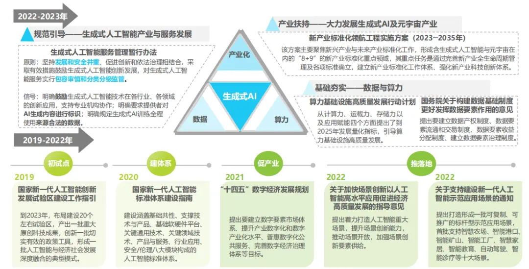 自2019年以来,我国人工智能相关政策始终紧随技术和产业发展步伐,历经广泛试点、建设框架、产业化发展、场景化落地四个阶段,切实推动人工智能从一项新兴技术走向规范应用。2023年,生成式AI为人工智能领域带来重大突破与新的希望,而围绕生成式AI的政策布局也迅速铺开,从数据和算力基础夯实,到快速对生成式AI规范化引导,再到产业扶持,形成一套强有力的组合拳。