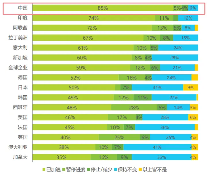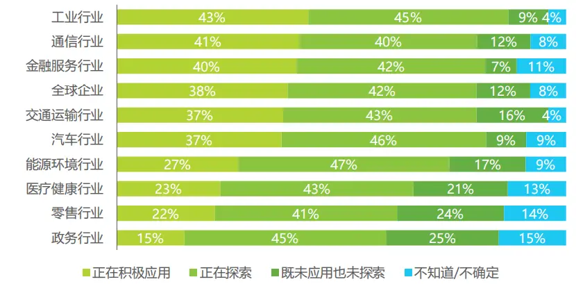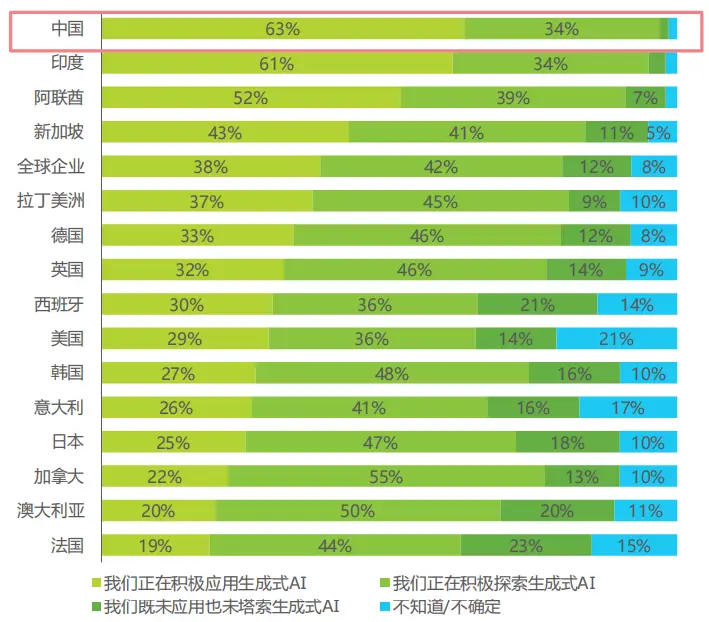 根据IBM发布的《2023年全球AI采用指数》的数据显示,2023年,有高达85%的中国企业表示在过去的一段时间里加快了对AI的投入应用,63%的中国企业表示正在积极应用生成式AI,34%的中国企业正在积极探索生成式AI。全球范围内,中国展示出了对AI应用的超前积极姿态,不仅关注投入AI技术的前沿动态,更致力于AI落地探索的实际应用,以获取新技术浪潮下的新一轮竞争性优势。