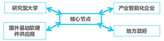 企业簇群是产业集群的关键构成要素,而人工智能企业簇群价值网络同样呈现极核状,少数核心节点是产业发展的主导。关键节点通过与研究型大学、国外基础软硬件供应商、产业智能化企业与地方政府的技术合作与交流,发挥辐射与带动作用,构成产业集群的灵魂所在。