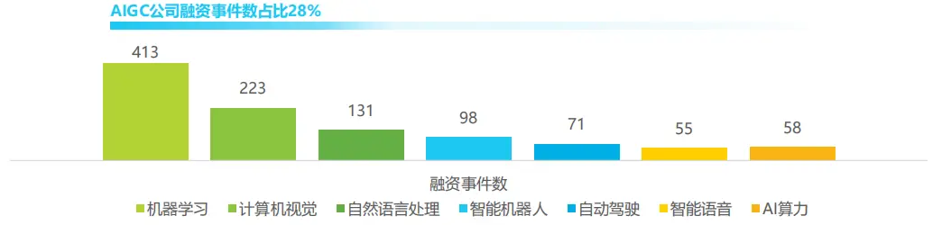 从2017-2022年,随着人工智能产业成熟度不断提升,融资逐步向中后期过渡,而在AIGC概念火爆的2023年,种子轮与天使轮融资重返主力位,在这其中,近40%的投资事件指向2023年新成立的AIGC公司,这表明AIGC正在引领AI产业新一轮融资周期。与此同时,原有AI各技术赛道也依然保持活力,机器学习使用最广,存在感最为明显,计算机视觉、NLP依然紧随其后。值得注意的是,AIGC相关融资占2023年AI产业全部融资事件的28%,并且在除机器人外的各个赛道均有渗透,成为年度AI融资的最大关键词。