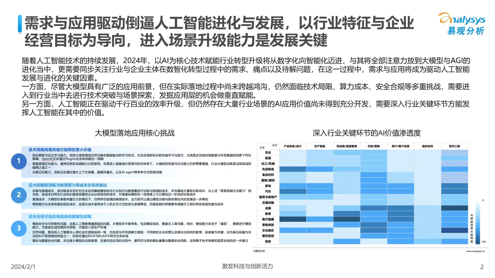 随着人工智能技术的持续发展,2024年,以A!为核心技术赋能行业转型升级将从数字化向智能化迈进,与其将全部注意力放到大模型与AGI的进化当中,更需要同步关注行业与企业主体在数智化转型过程中的需求、痛点以及待解问题,在这一过程中,需求与应用将成为驱动人工智能发展与进化的关键因素。