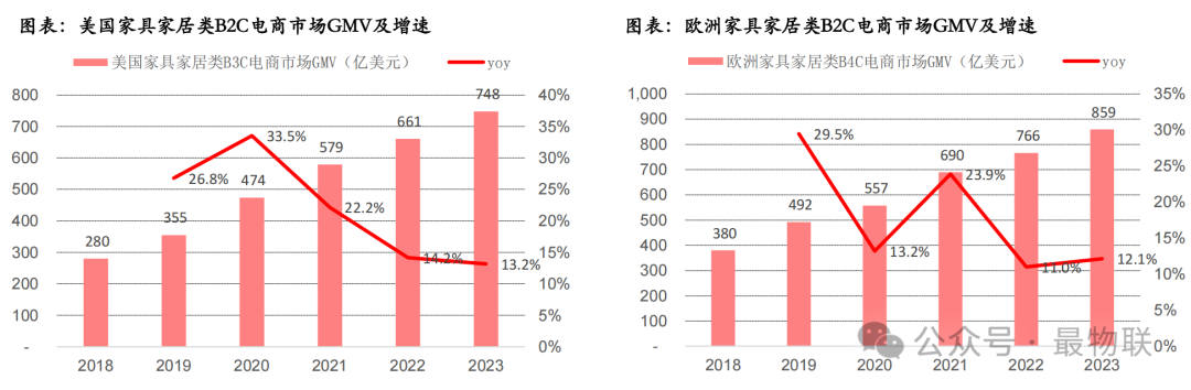 1)全球家具家居电商化率提升:2023年全球家具家居类B2C电商市场GMV达3258亿美元/+12.8%,电商渠道份额占比达25%(低于服装/31%、家电/38%、消费电子/45%),其中,美国家具家居类B2C电商GMV为748亿美元/+13.2%、欧洲为859亿美元/+12.1%。数字化转型网www.szhzxw.cn