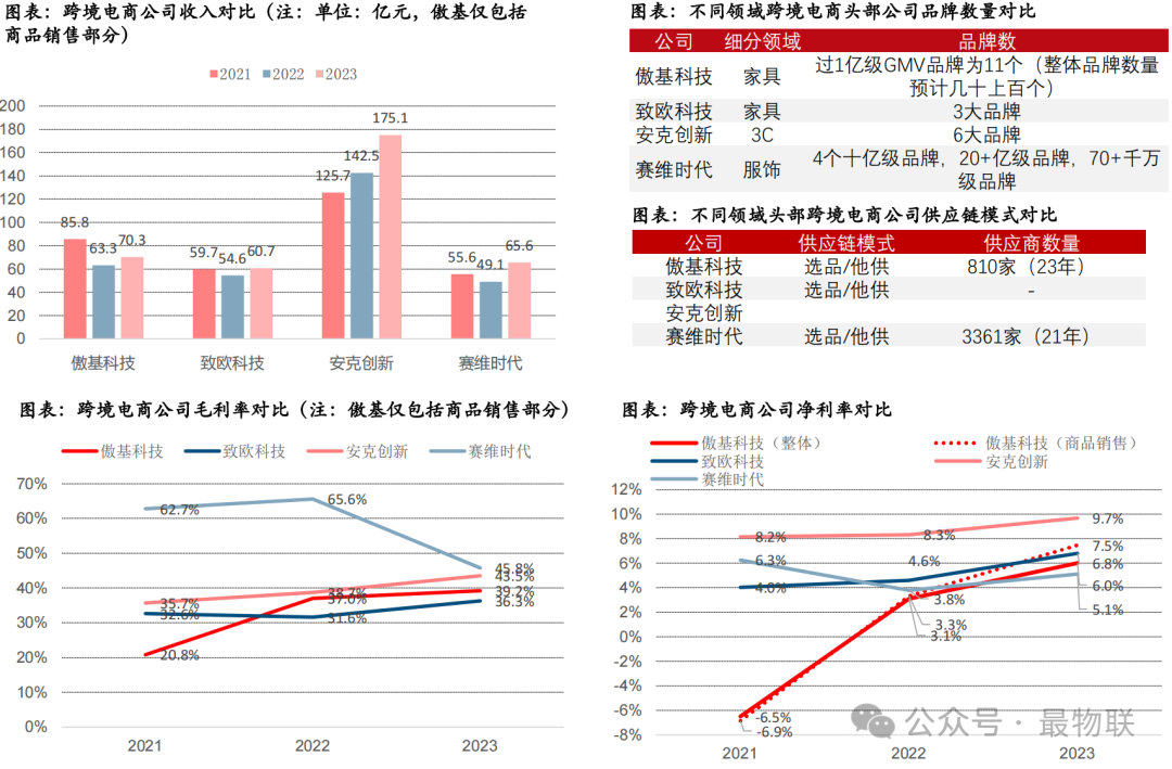 对比安克创新(3C跨境电商)、赛维时代(服饰跨境电商),傲基科技&致欧科技(家具类跨境电商)毛利率略低、净利率处居中水平(中高个位数)。23年毛利率分别为:致欧科技/36%、傲基科技(商品)/39%、安克创新/44%、赛维时代/46%,23年净利率分别为:致欧科技/6.8%、傲基科技(商品)/7.5%、安克创新/9.7% 、赛维时代/5.1% 。数字化转型网www.szhzxw.cn