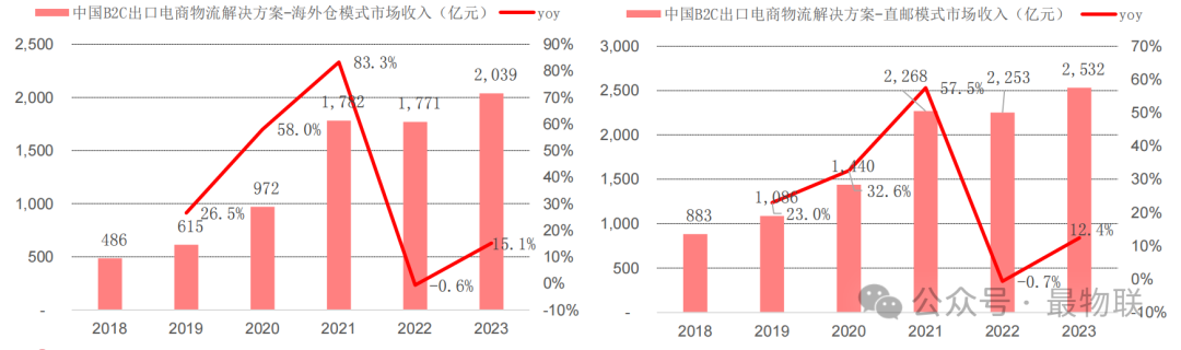 2023年采用海外仓模式的中国B2C出口电商物流解决方案市场规模达2039亿元/+15.1%,占据出口电商物流市场规模的44.6%,直邮模式市场规模2532亿元/+12.4%。