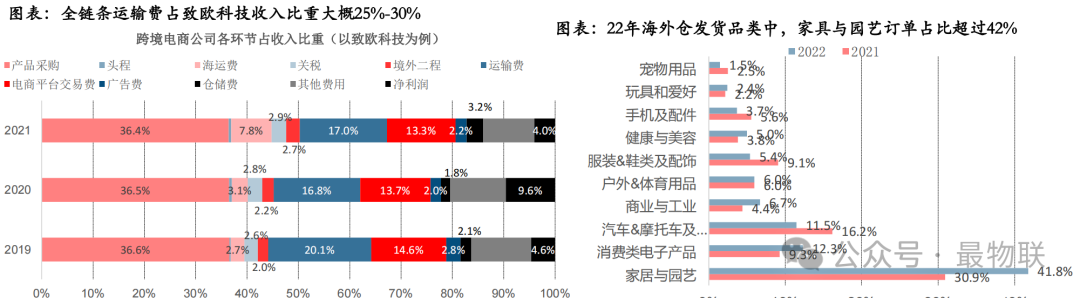 小型商品在选择送货方式上有更大的灵活性,中大件商品运费占比较高(以致欧科技为例,全链条运输费占致欧科技收入比重大概25%-30%),无法实现低成本的空运直邮,海外仓更受青睐。