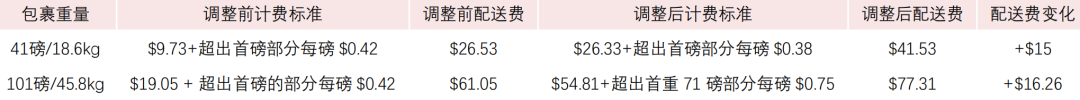 图表:亚马逊FBA超标件的包裹配送费变化举例(2024.2.5变更,超大尺寸指最长边超过 59 英寸、次长边超过 33 英寸、最短边超过 33 英寸或者长度 + 围长超过 130 英寸,或者商品重量/体积重量中的较大值超过 50 磅/22.7kg)数字化转型网www.szhzxw.cn