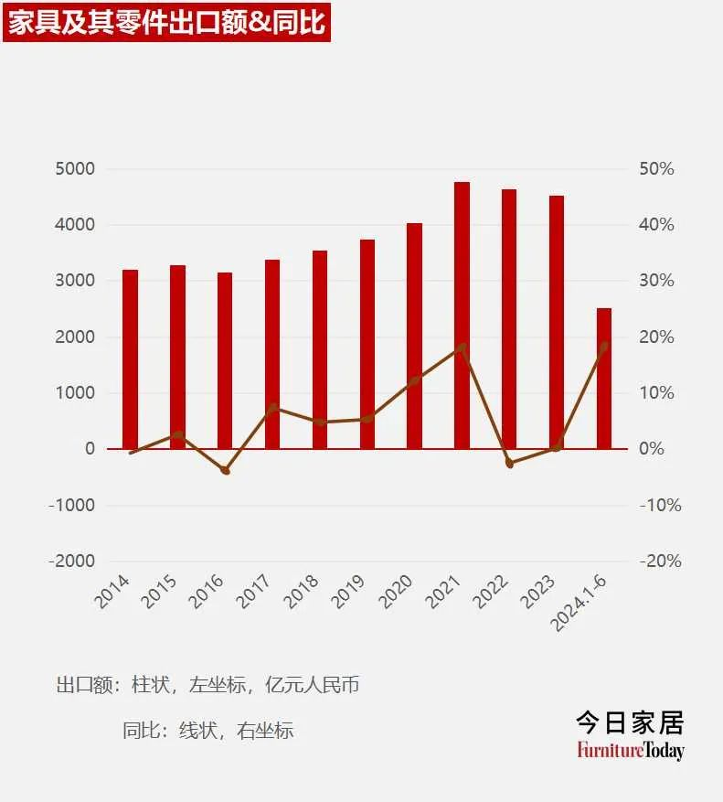 2014年至2023年,家具及其零件出口额复合增长率为3.92%。2024年1~6月份累计增长率同比18.3%,累计达2513.3亿元,6月份单月的数据放缓,单月同比增长7.63%。2014年至2023年,床垫、寝具及类似品出口额复合增长率为5.15%。2024年1~6月份累计增长率同比10.22%,累计达398.23亿元,6月份单月出口额同比大增14.88%。