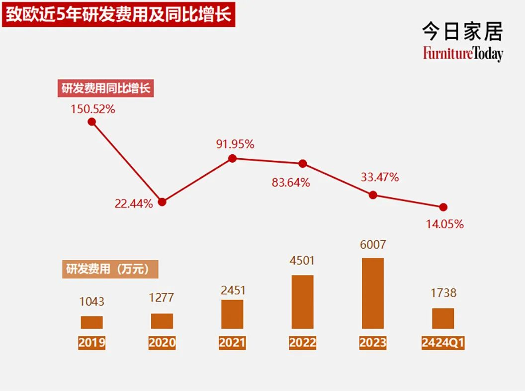 致欧家居的研发投入一直在增长,2021年和2022年的研发投入同比增长高达91.95%和83.64%。