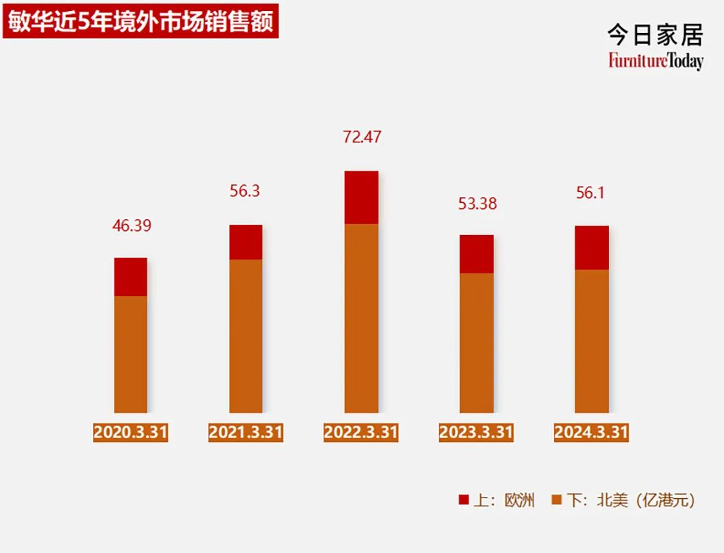 敏华在欧洲+北美市场的销售额,稳定在50~60亿港元区间,2020~2024.3.31欧洲+北美市场收入的复合增长率为4.9%。